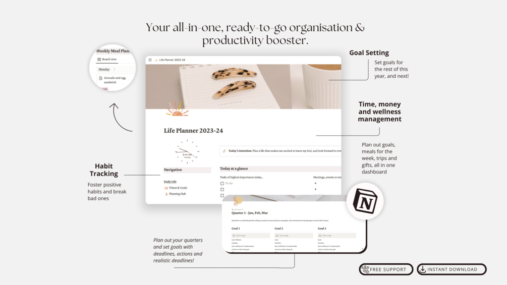 Tired of the Notion overwhelm? Say hello to the ultimate All-In-One Notion Life Planner, designed to transform your life effortlessly. No more building dashboards from scratch or drowning in the details.
