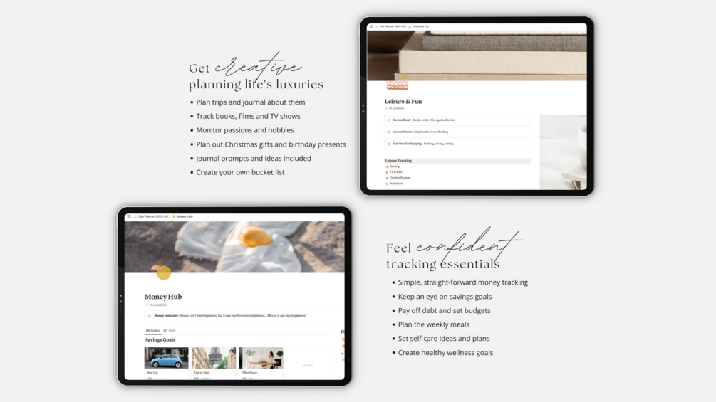 Money Hub: Track finances effortlessly with visual progress bars, financial trackers, debt repayment pages, and more.