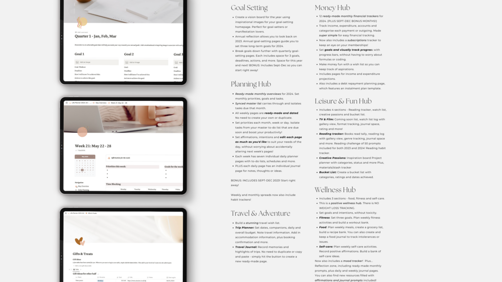 Why waste precious time on setup? Every month, week, and day is meticulously crafted and dated, saving you the hassle of manual duplication. Embrace the freedom to focus on what truly matters—your goals, habits, fitness, finances, and more—all seamlessly organized in a single, power-packed planner.