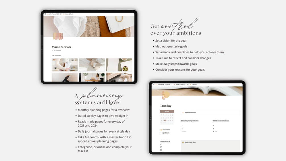 Vision and Goals: Visualize, reflect, and plan with vision boards, goal settings, and insightful journal pages.