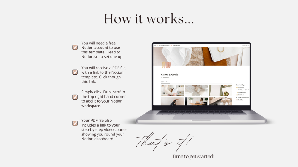 Remember, this is a PDF download which links to your new Notion template. Simply duplicate it in your free Notion account and dive into a life-changing experience. Plus, claim your free course with just your email!