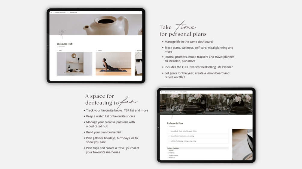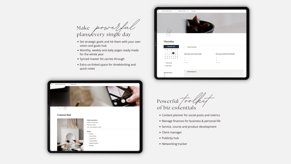 It includes indispensable tools such as a content planner, client management system, client dashboards for enhanced interactions, revenue and expenses tracking, and cherished features from the bestselling Life Planner. Immerse yourself in the wellness hub, reading tracker, trip planner, and an array of invaluable features.