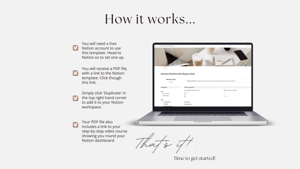 A PDF document linking to your new Notion dashboard, as well as instructions on how to get your tutorials!