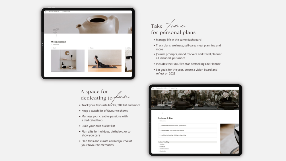 The possibilities are endless! Plan new products, save time, strategize content, and achieve fitness goals. Say goodbye to juggling multiple templates. Everything, from your reading tracker to holiday planner, wellness hub, and more, is housed within this comprehensive planner.