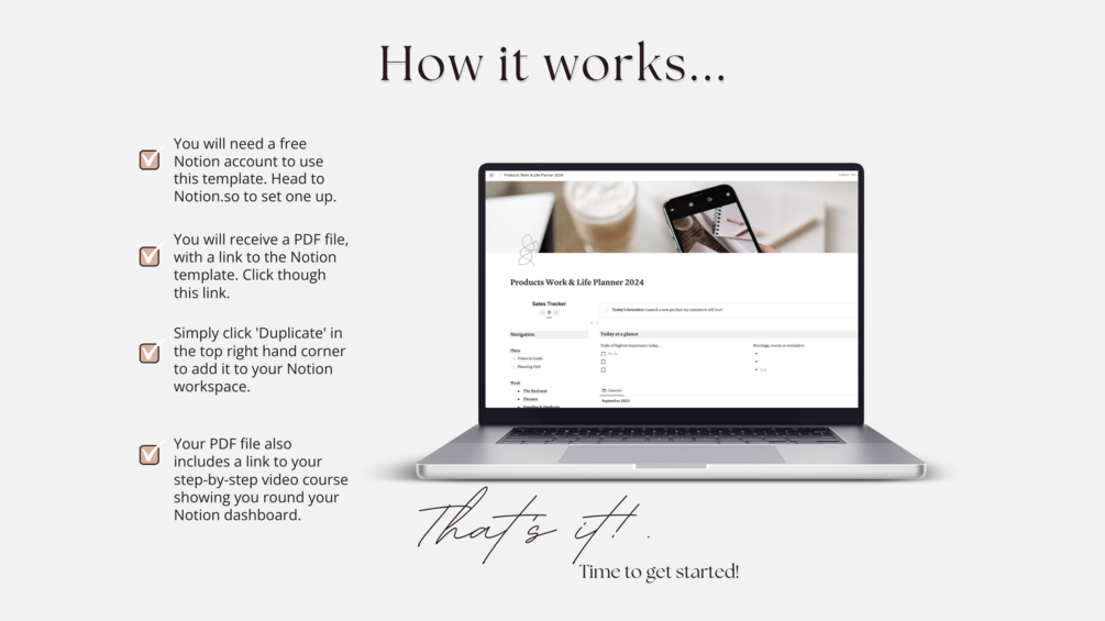 A PDF document linking to your new Notion dashboard, as well as instructions on how to get your tutorials!