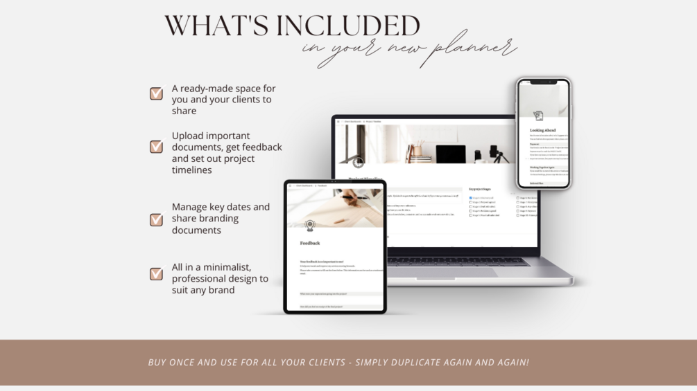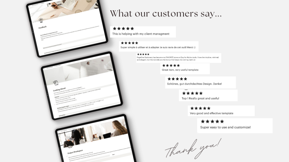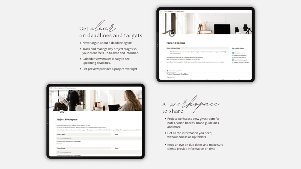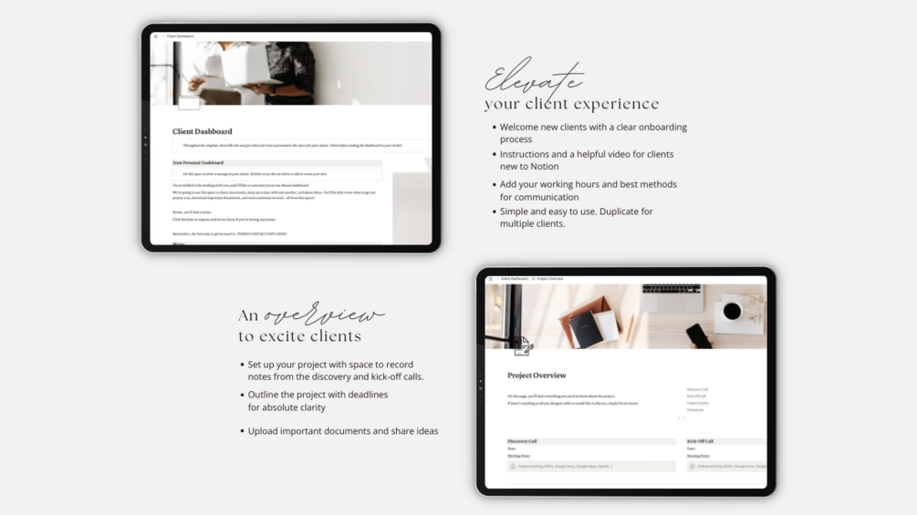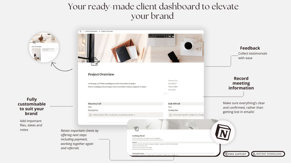 Worried if your clients are new to Notion? Don't fret. We’ve included user-friendly instructions. With a neutral color scheme that blends seamlessly with any brand, carefully curated images, and easy customization, it's your canvas to reflect your business personality.