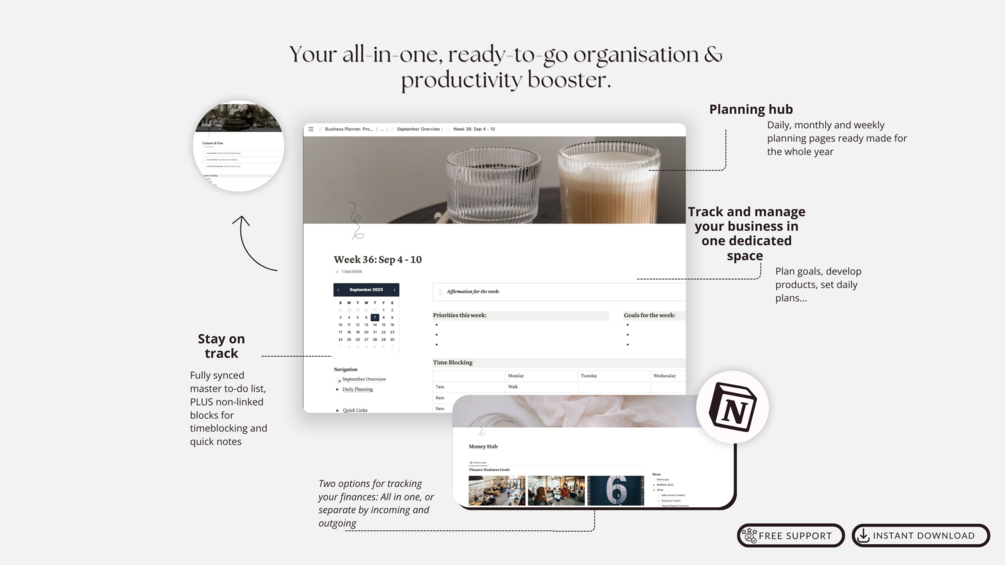Running a business comes with its chaos. This planner isn't just about organisation; it's about creating a life of simplicity and elegance. Store your brand's essence, your meeting notes, your daily to-dos, and every intricate detail of your business, beautifully organised under one digital roof.